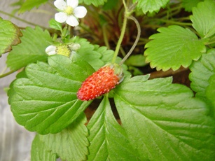 今朝 一つだけ赤く色付いたワイルドストロベリーの実を見つけました。